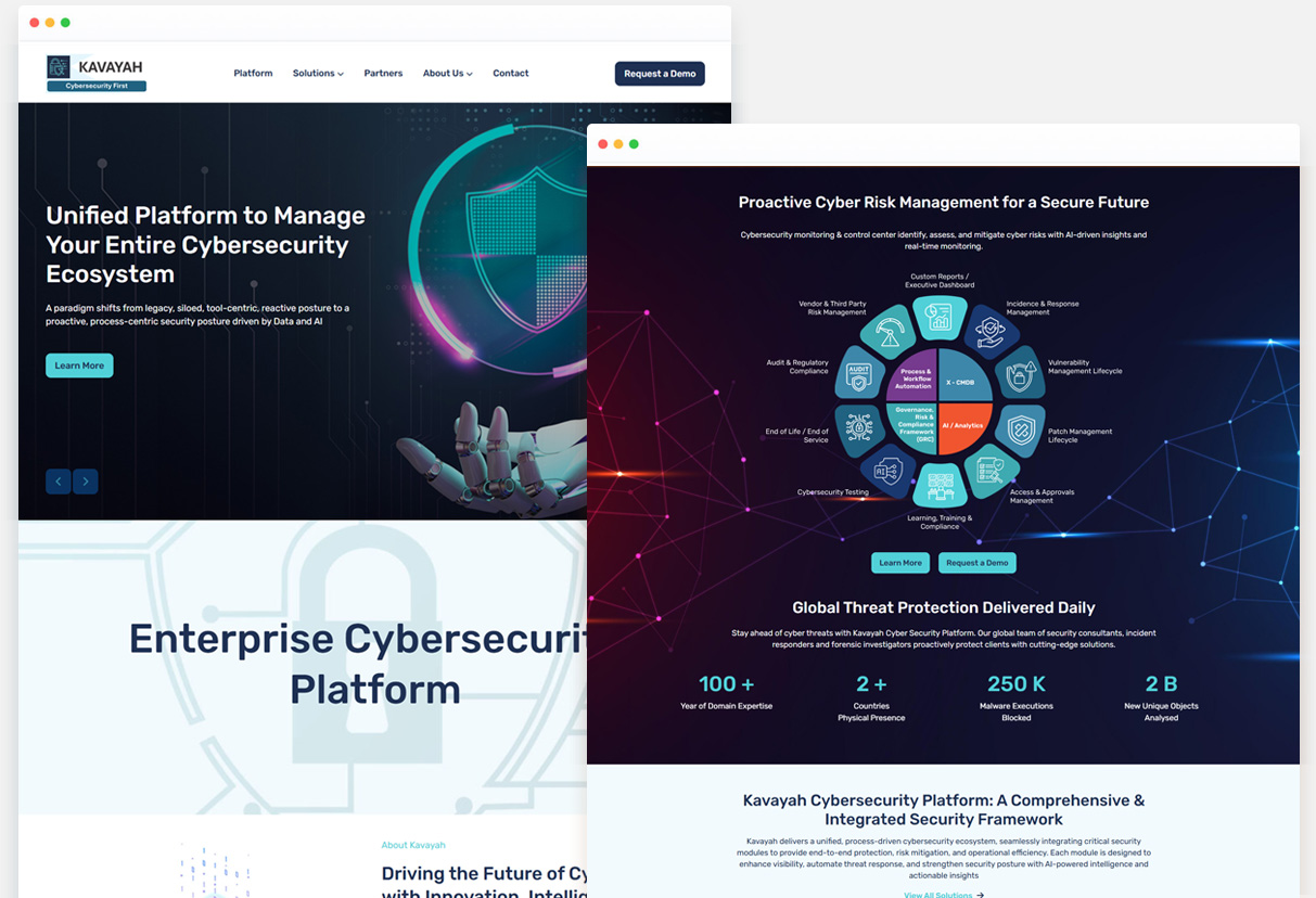 Kavayah Cybersecurity is a cutting-edge cybersecurity start-up dedicated to delivering tailored security solutions for medium to large enterprises. Our bespoke, responsive website is designed to provide an intuitive user experience while clearly communicating our company mission, platform capabilities, and comprehensive suite of cybersecurity services. Engineered with SEO best practices in mind, our website ensures optimal visibility and engagement